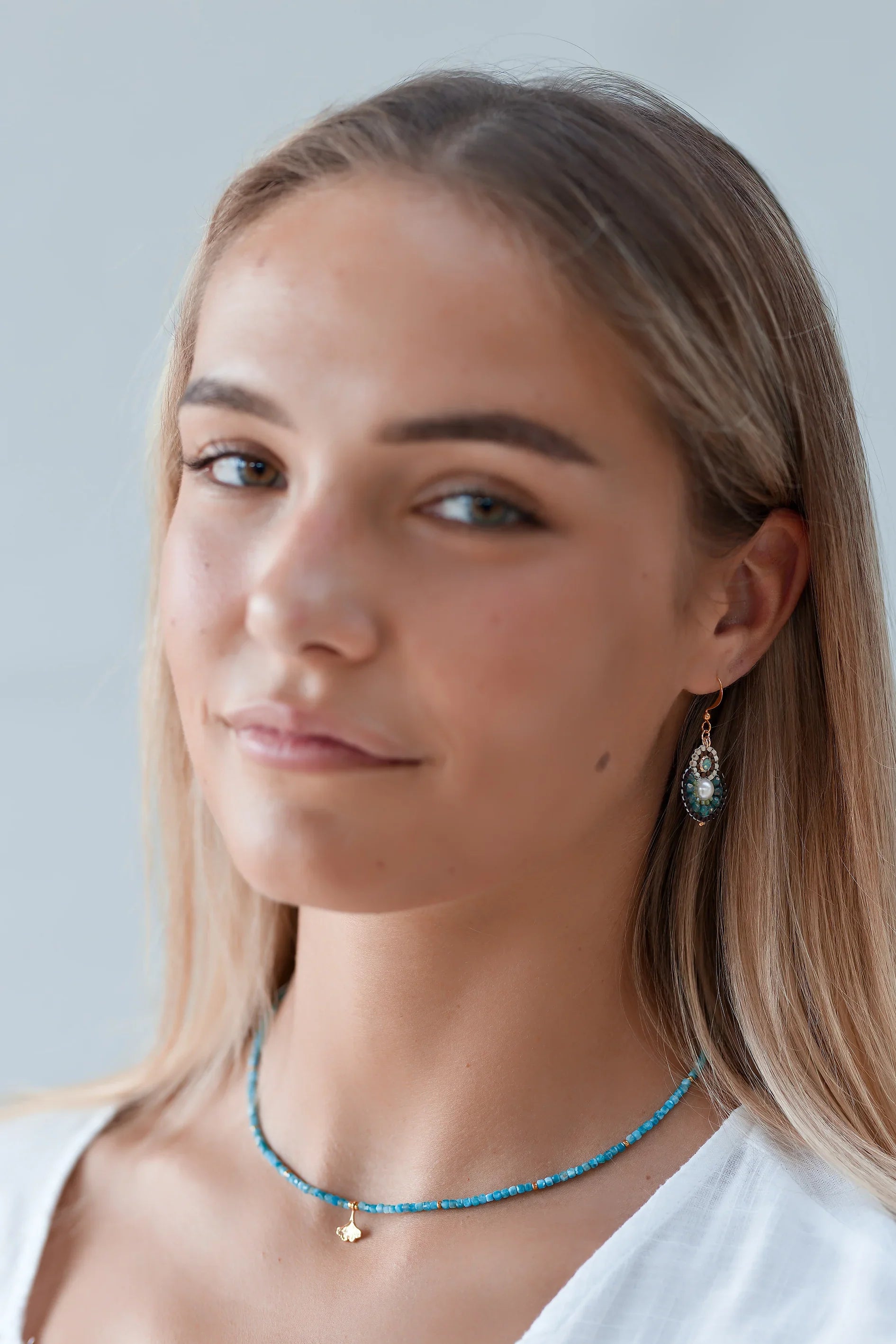 Feel the ocean's tranquil energy with this delicate apatite necklace. Light dances across the sea-blue gemstones that inspire independence while boosting your confidence and focus. The gold-plated ginkgo charm catches the light beautifully, symbolising strength while adding sophistication to any outfit.