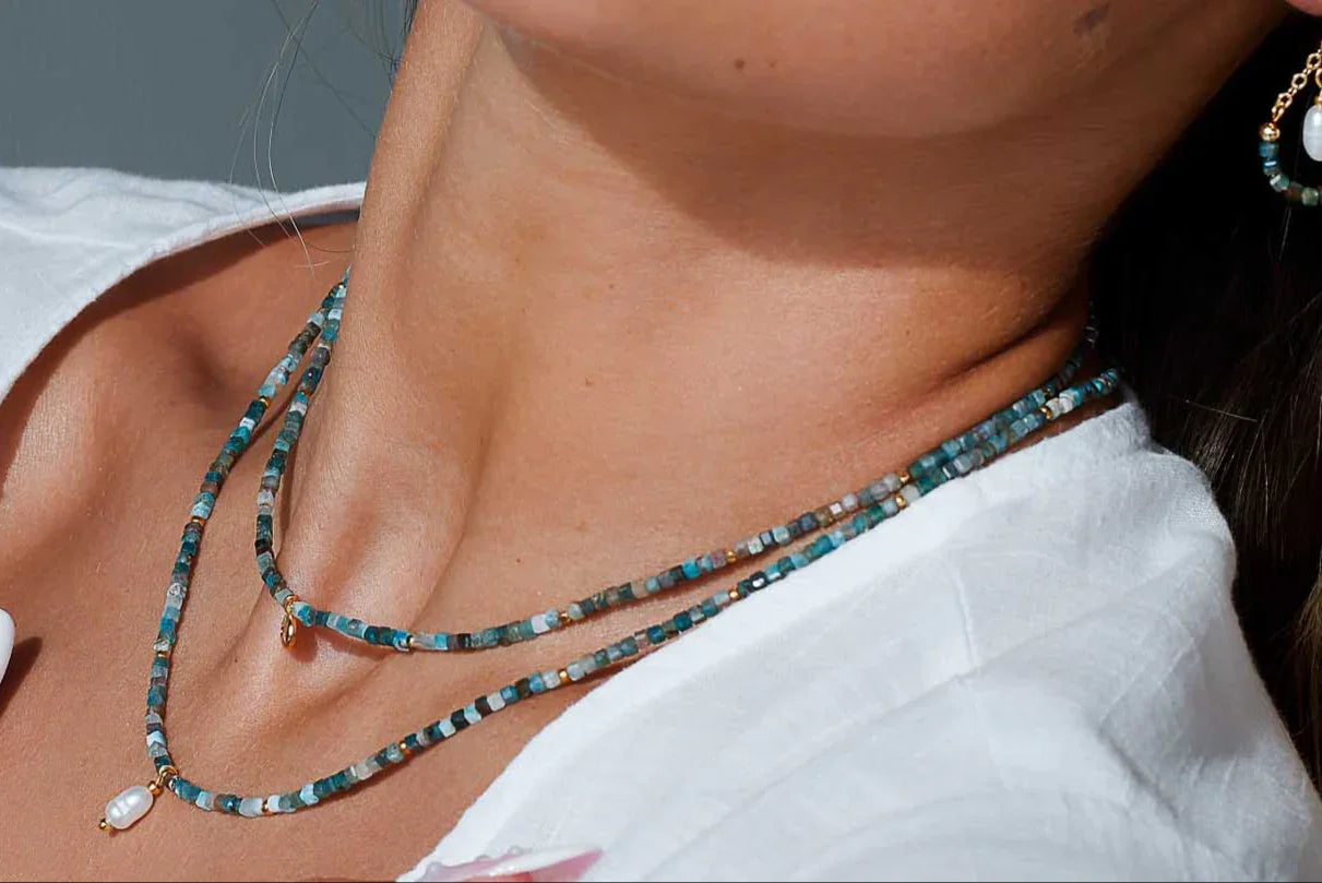 Dive into deeper waters with this enchanting dark apatite necklace. The mysterious, midnight-blue stones bridge your dreams and reality, helping you manifest your deepest desires through powerful self-expression.